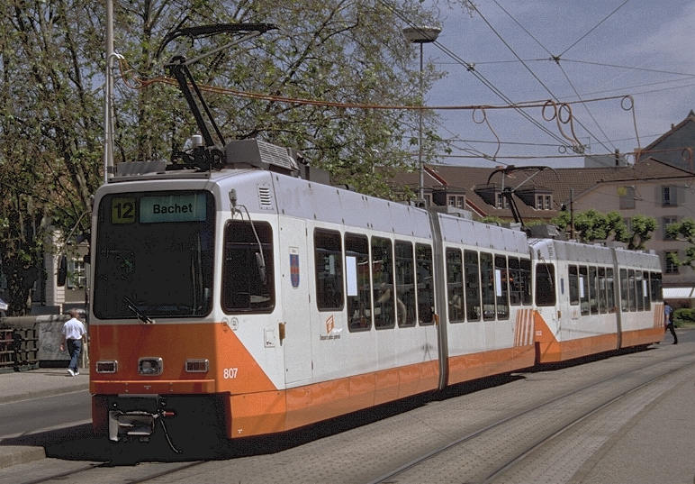 Hersteller: Vevey/DUEWAG/BBC, 1988 (Serie 807-830) Länge: 21,90 m Breite: 2,30 m Masse: ca. 27,5 t Stundenleistung: 2x 150 kW Spurweite: 1000 mm
