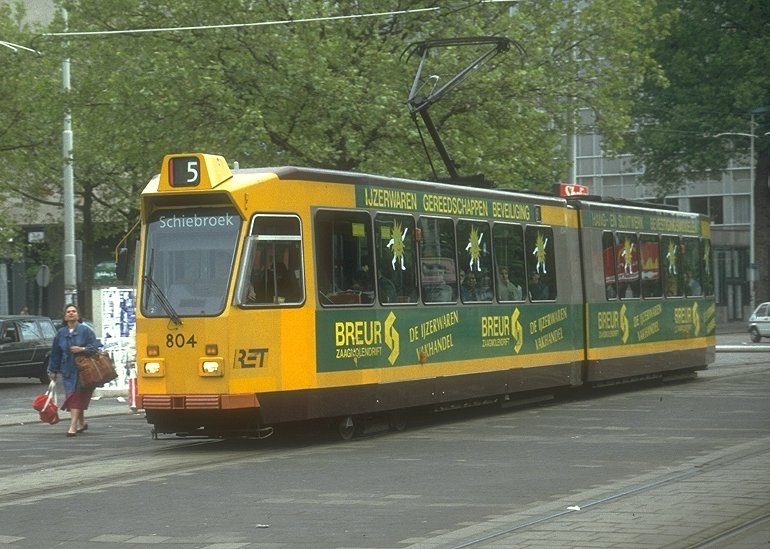 Hersteller: DUEWAG/Holec/RET, 1984-88 (Serie 801-850 unter Verwendung von Teilen ex 301-324 und 351-386, DUEWAG 1964/65) Länge: 23,13 m Breite: 2,34 m Masse: 24,5 t Stundenleistung: 4 x 48 kW Spurweite: 1435 mm